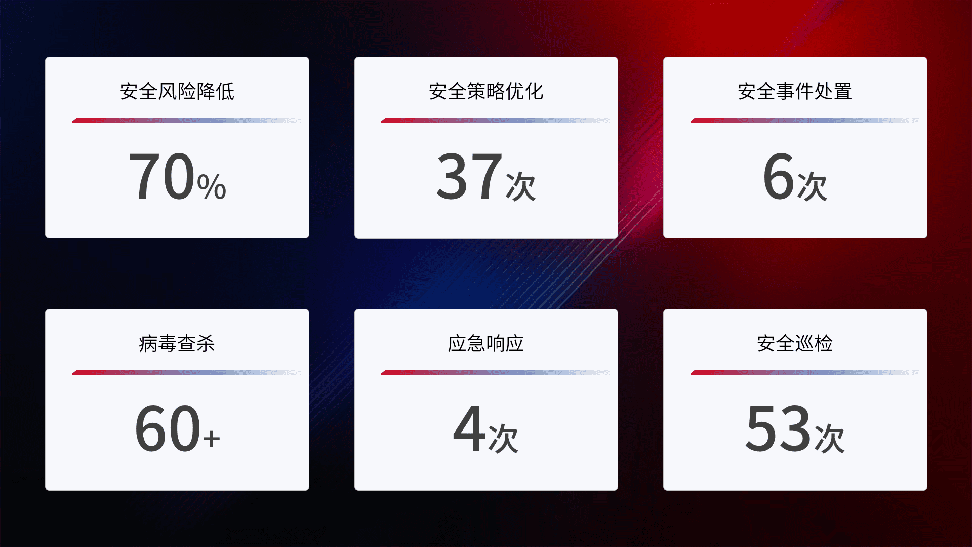 提供全面的安全事件报告体系,,,,包括处置报告、、周报、、季度和年度总结,,,,结合持续监控,,,帮助客户深入了解网络安全状况。。。。